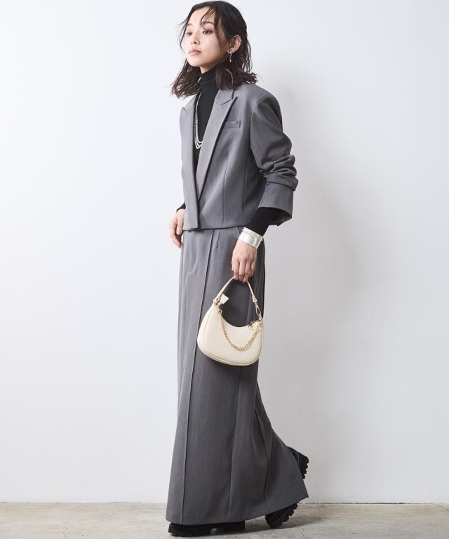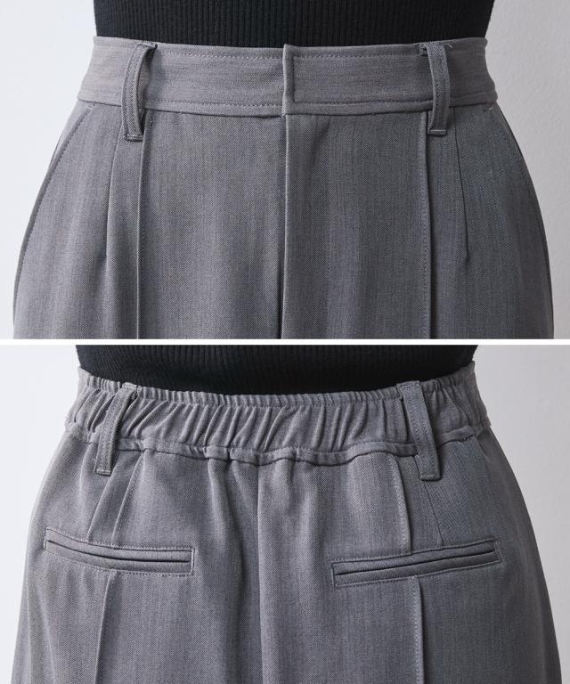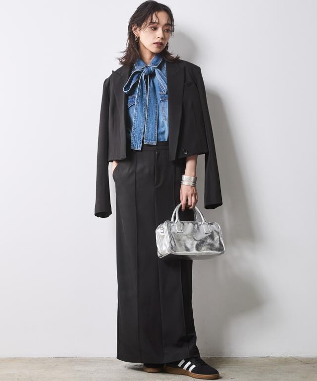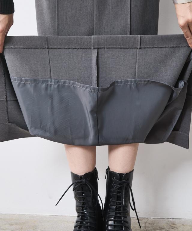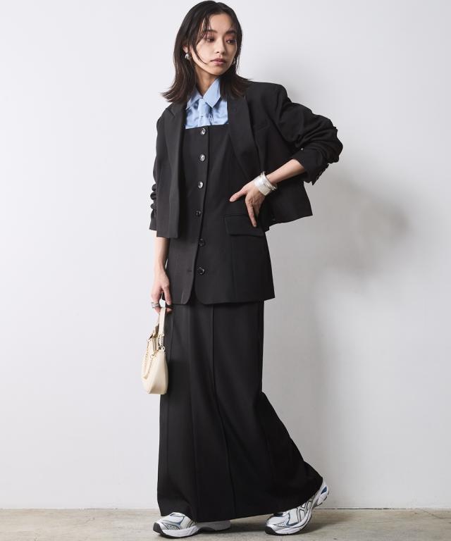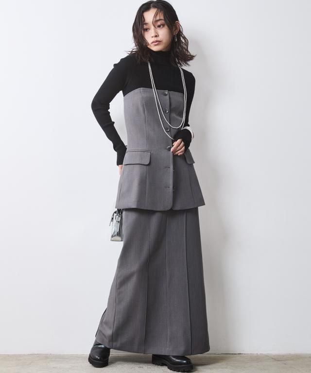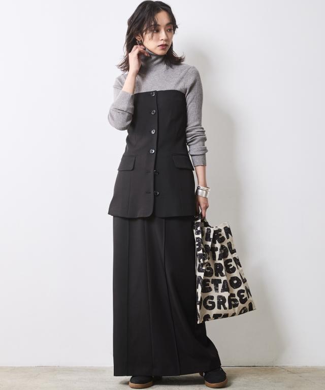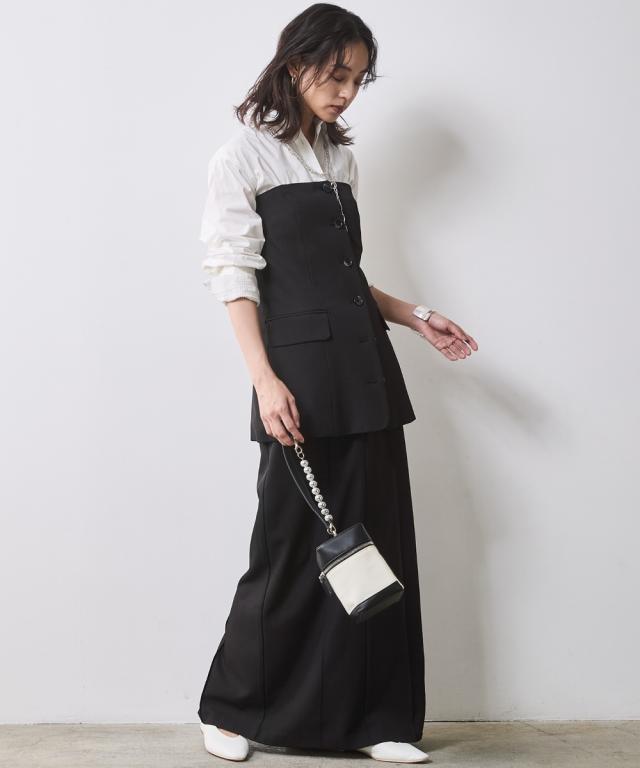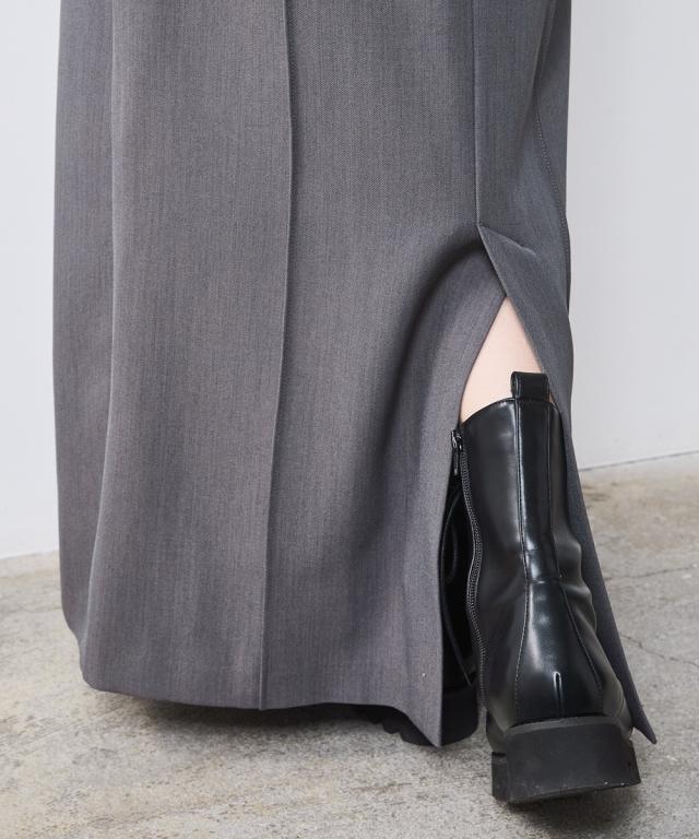 ハンサムなマキシタイトスカート。 ■デザイン パンツのディテールを入れ込んだマキシ丈タイトスカート。 程よいフィット感のあるサイジングで大人っぽく女性らしいシルエットを演出してくれます。 後ウエストはゴム仕様で快適な履き心地。 パンツディテールのつまみが縦に入っていることでタテラインが強調されスタイルアップ効果も。 ■素材 シーズンレスに使えるライトウェイトなスーチング素材。 ポリエステルの丈夫さとレーヨンの持つ落ち感で上品な光沢感と手触りの良さを併せ持つ素材を使用。 ■おすすめのスタイリング 合わせるトップスでオンにもオフにもイメージを変えられる万能スカート。