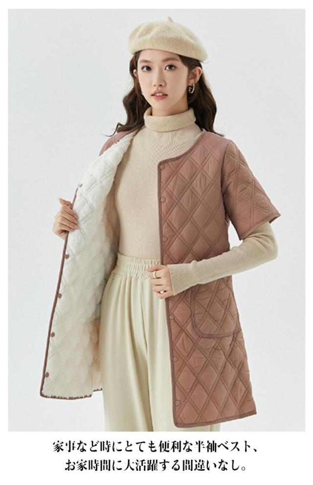 裏起毛 ハーフスリーブ ハーフコート 中綿ジャケット ジャケット レディース ロング丈 ノーカラー アウター ロング丈 裏ボア キルティングベスト インナージャケット 中綿 キルト 軽量 ポケット付き 防寒 防風 保暖 中綿入り ブルゾン