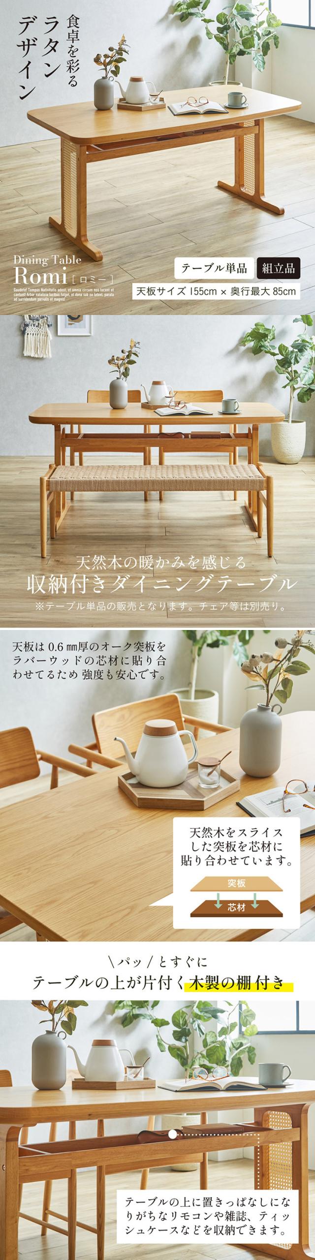 ダイニングテーブル 4人掛け 幅155cm 単品 ラタン ダイニングテーブル Romi(ロミー) ダイニング テーブル 長方形 食卓テーブル ワークデスク カフェテーブル 収納 天然木 ナチュラル 作業台 おしゃれ モダン