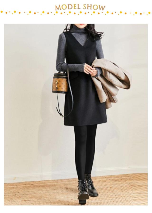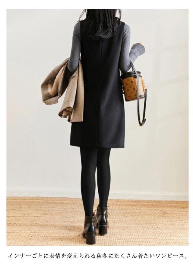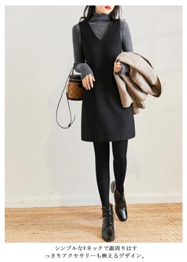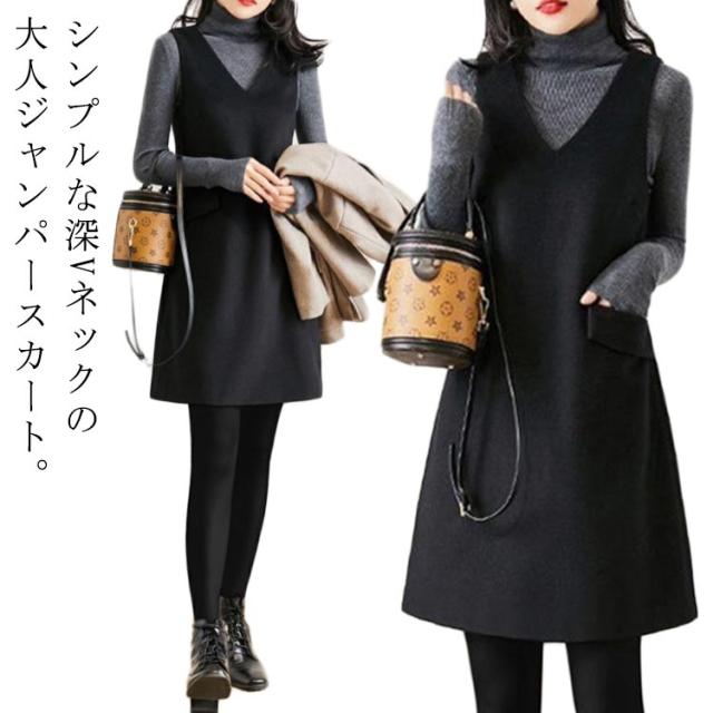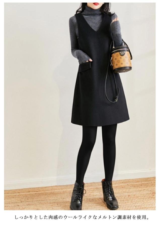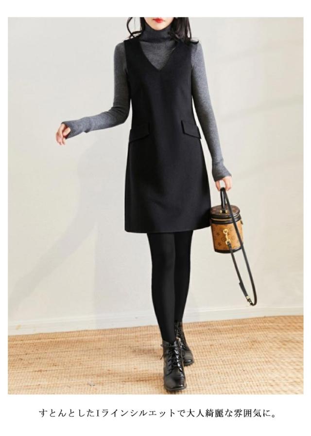 ジャンパースカート Vネック レディース 秋 冬 ワンピース ノースリーブ ジャンスカ ミディアム丈 膝上丈 ニットメルトン ツイード風 ポケット付き 大人 フォーマル セレモニー 通勤 オフィス レイヤード 重ね着 30代 40代 50代 ミニマル 無地 シンプル 黒 【送無】