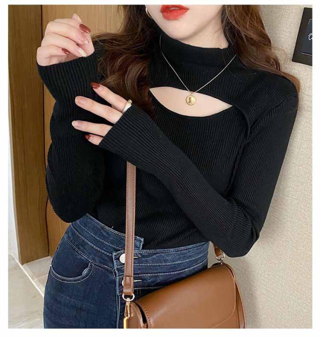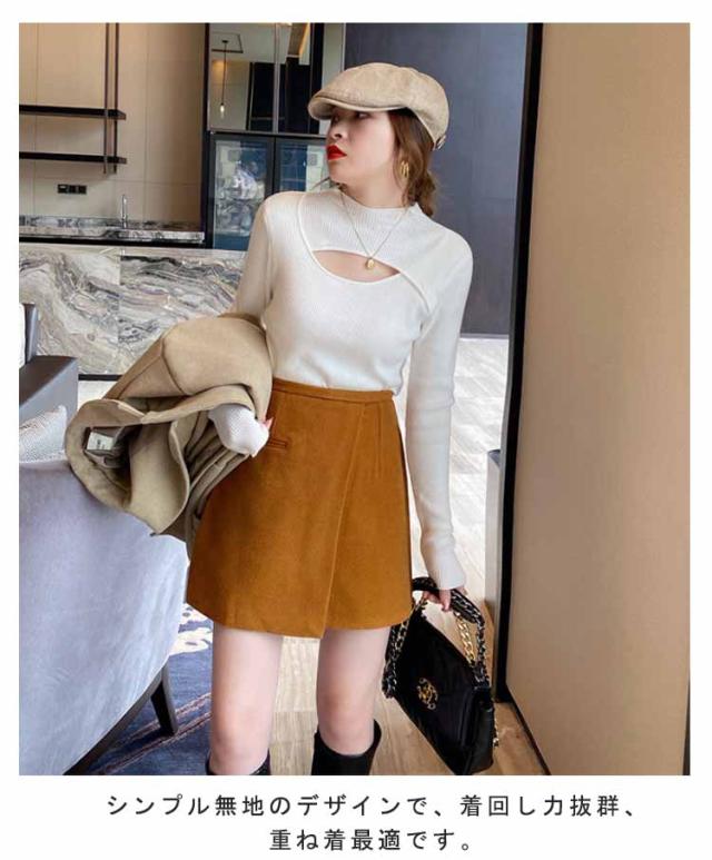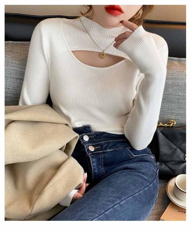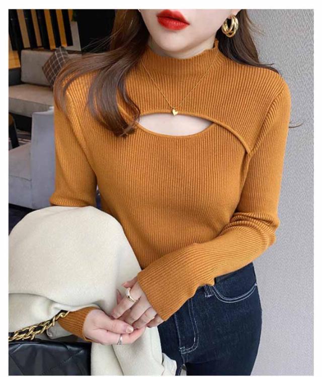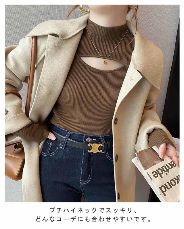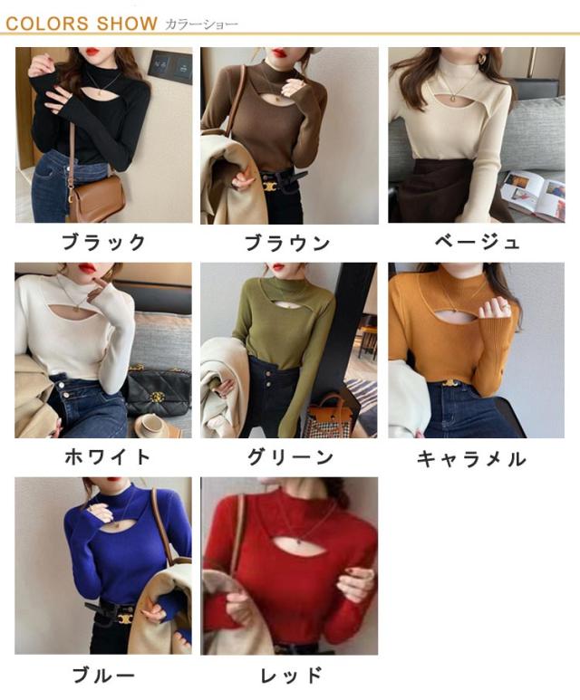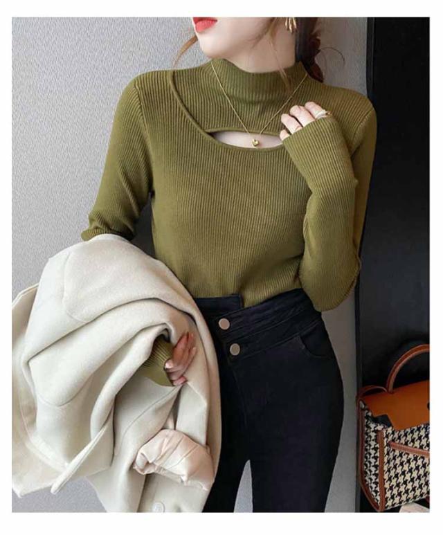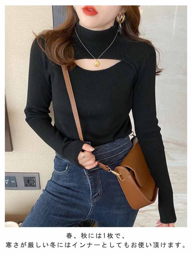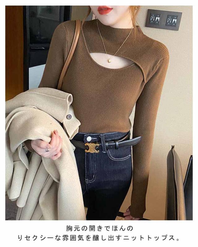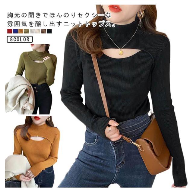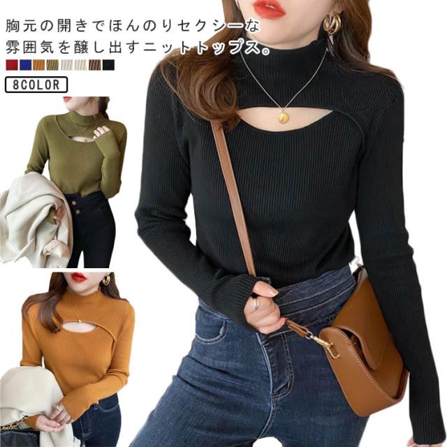 リブニット トップス 胸開き 肌見せ プチハイネック フロントオープン モックネック 長袖 ニットセーター セクシー きれいめ 可愛い インナー スリム 伸縮性 秋冬 フェミニン 20代 30代 40代 50代 ハイネック ニット 送料無料
