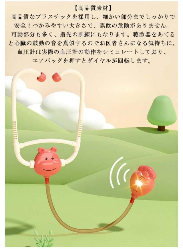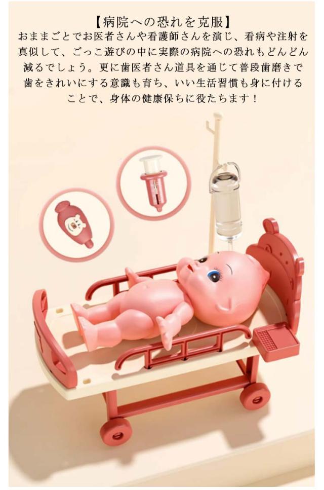 | 豪華な72点お医者さんままごとセット。収納ケース付き! 【豪華なお医者さんごっこ】医療キットセットには、聴診器、鉗子、眼鏡、口腔鏡、点滴、注射器、温度計メス、懐中電灯、ピンセット、などお医者さん実際に使用する道具が数多く備えております。 【高品質素材】高品質なプラスチックを採用し、細かい部分までしっかりで安全!つかみやすい大きさで、誤飲の危険がありません。可動部分も多く、指先の訓練にもなります。聴診器をあてると心臓の鼓動の音を真似するのでお医者さんになる気持ちに。血圧計は実際の血圧計の動作をシミュレートしており、エアバッグを押すとダイヤルが回転します。 【可愛い収納ケース付き】かわいい収納ケース付き、遊んた後バラバラのおもちゃを収納することでお子さんの整理意識も養えるでしょう。持出も便利! 【病院への恐れを克服】おままごとでお医者さんや看護師さんを演じ、看病や注射を真似して、ごっこ遊びの中に実際の病院への恐れもどんどん減るでしょう。更に歯医者さん道具を通じて普段歯磨きで歯をきれいにする意識も育ち、いい生活習慣も身に付けることで、身体の健康保ちに役たちます! 【完璧な贈り物】お誕生日、クリスマス、ハロウィン、こどもの日、入園祝い、新年などに子供への最適なプレゼントです。 | |