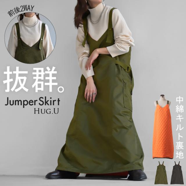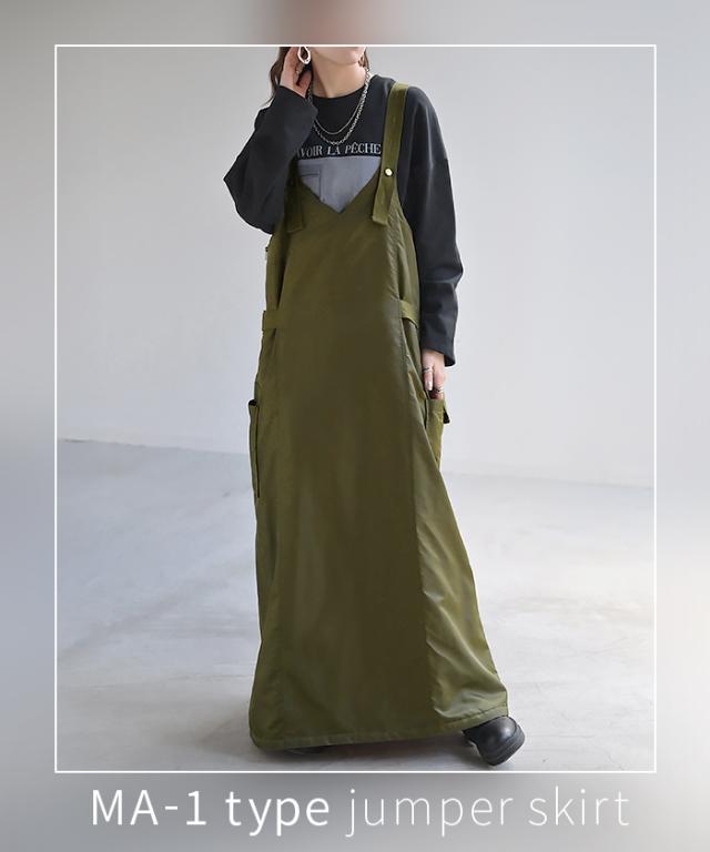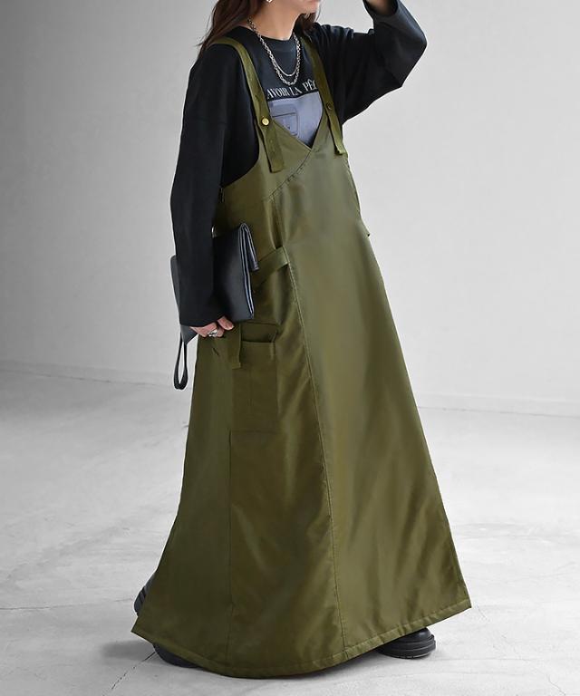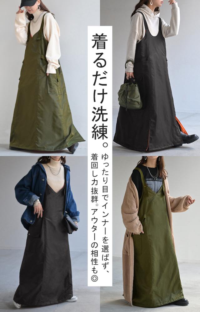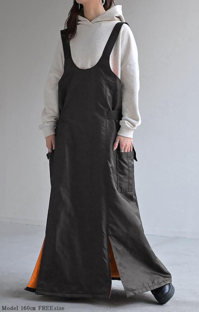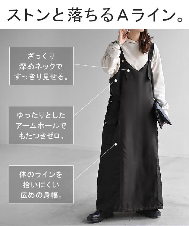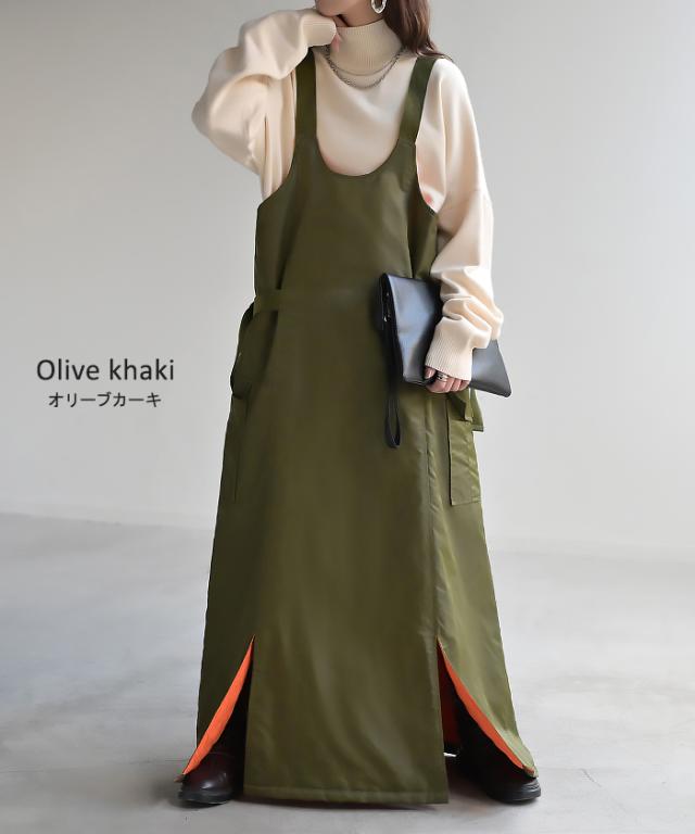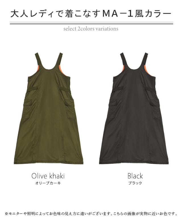 ワンピース MA-1 ジャンパースカート レディース ワンピ ロング ロングワンピース Aライン マキシ マキシワンピース ワンピ ロングワンピ ノースリーブ タンクトップ 重ね着 レイヤード 体型カバー 大きいサイズ 無地 黒 カーキ 秋 冬 HUG.U 秋新作