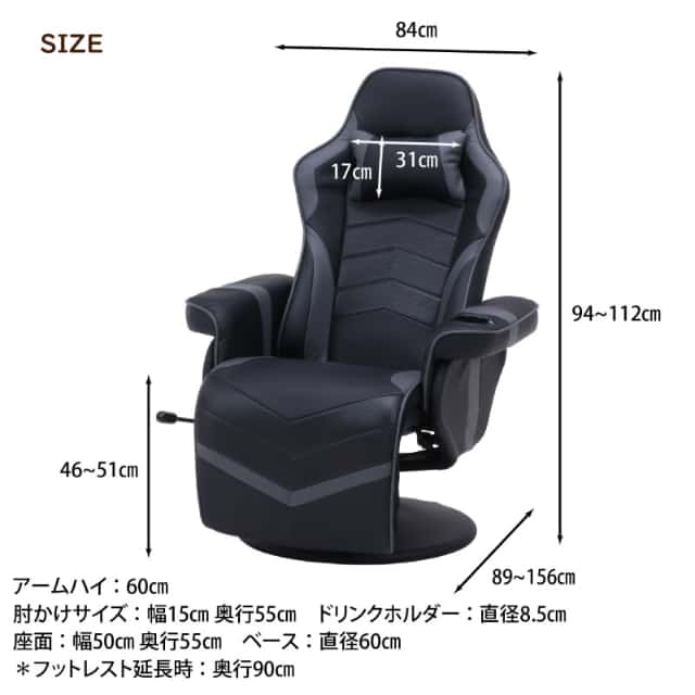 | 商品サイズ | 全体: 幅840×奥行890〜1560×高さ940〜1120mm 座面高:460〜510mm 耐荷重(座面):80kg リクライニング傾斜:110-140度 |
