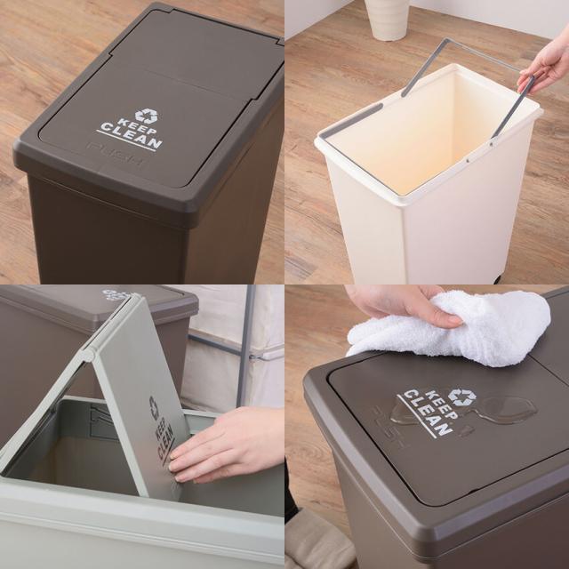 しっとりと落ち着いた、ツヤ消し・マットなカラーの3色展開。袋止めは、真ん中から手前側と奥側それぞれに可動するタイプ。ゴミ箱の蓋はプッシュタイプ。蓋を押すだけで、蓋が開閉します。移動に便利なキャスター付。キャスターは縦方向に可動します。