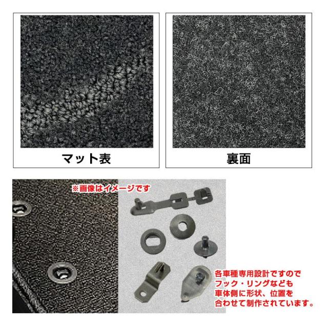 ■フロアマットのズレ防止用のストッパーホールは基本的に純正品と同じ位置に付いていますが、特殊な形状のタイプには対応しておりません。その場合、汎用の留め具 or 裏側にマジックテープの仕様となります。特殊な純正金具が車輌側に取り付けされている場合は、車輌側の金具を取り外してからフロアマットを敷いて下さい。
