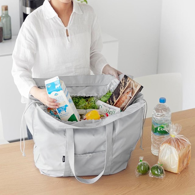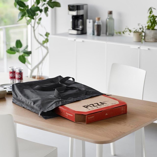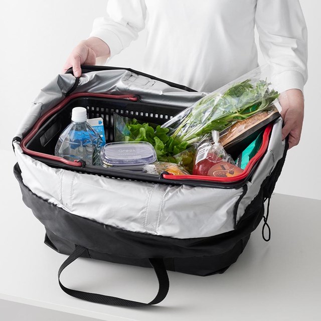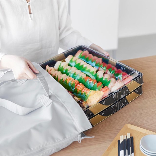 傾けたくない持ち帰り寿司やピザも入ってフレキシブルに変化する洗える保冷保温のエコバッグ。
