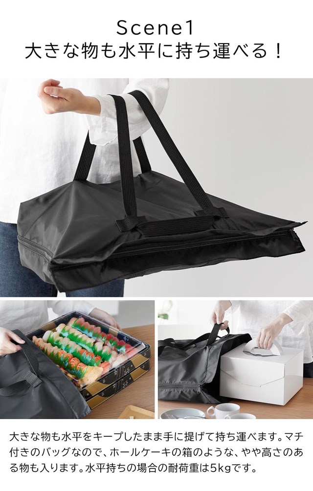 持ち帰り寿司やピザを水平持ちできる手提げにも変化します。