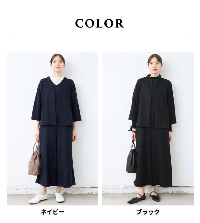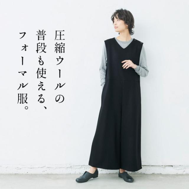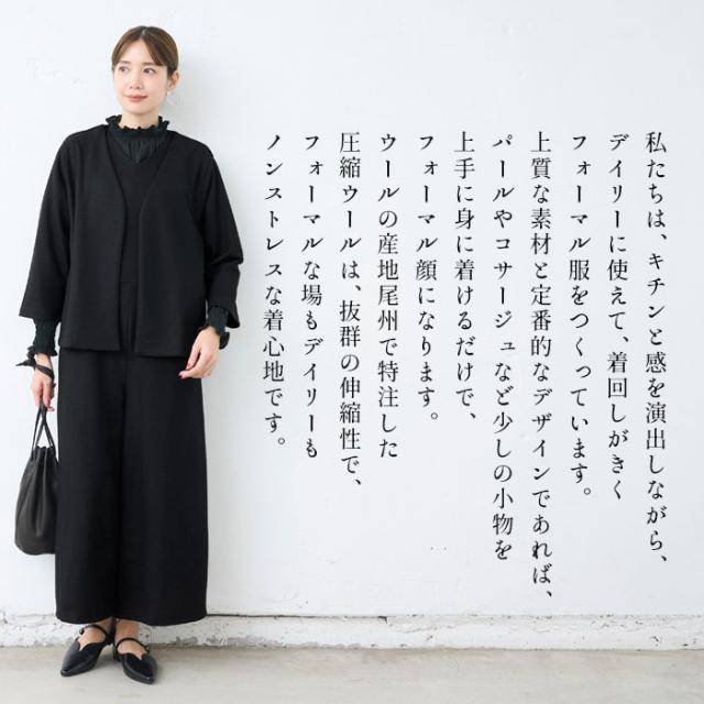 特徴 ON/OFF着回しがきく。ウール100%で暖かい。ストレッチで疲れにくい。ゆったりシルエットで体型カバー。私たちは、キチンと感を演出しながら、デイリーに使えて、着回しがきくフォーマル服をつくっています。上質な素材と定番的なデザインであれば、パールやコサージュなど少しの小物を上手に身に着けるだけで、フォーマル顔になります。ウールの産地尾州で特注した圧縮ウールは、抜群の伸縮性で、フォーマルな場もデイリーもノンストレスな着心地です。