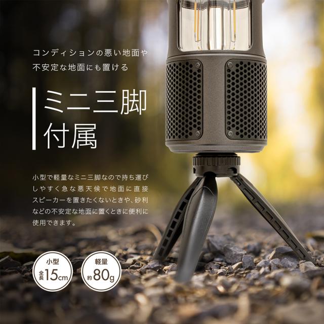 | 全長15cmと小型で重量80gと軽量な持ち運びしやすいミニ三脚が付属していますので、急な悪天候などでコンディションの悪い地面に直接スピーカーを置きたくないときや砂利などの不安定な場所に置くときに便利に使用できます。 |