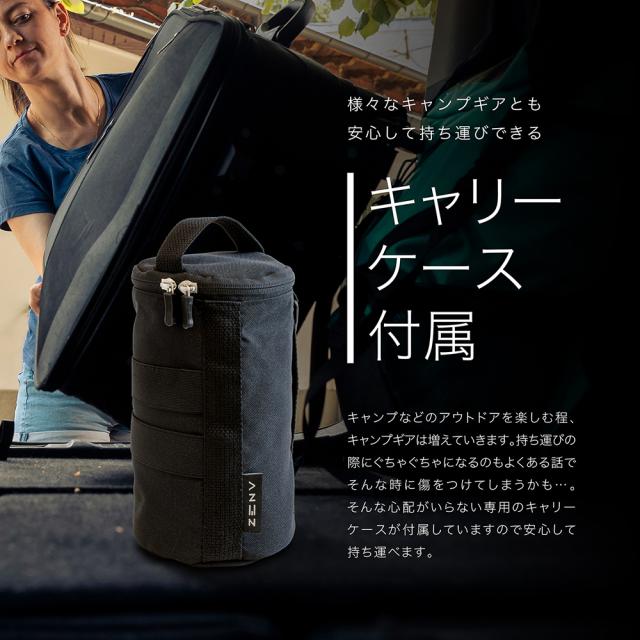 | キャンプなどのアウトドアを楽しむ程、キャンプギアは増えていきます。持ち運びの際にぐちゃぐちゃになるのもよくある話でそんな時に傷をつけてしまうかも…。そんな心配がいらない専用のキャリーケースが付属していますので様々なキャンプギアとも安心して持ち運べます。 |
