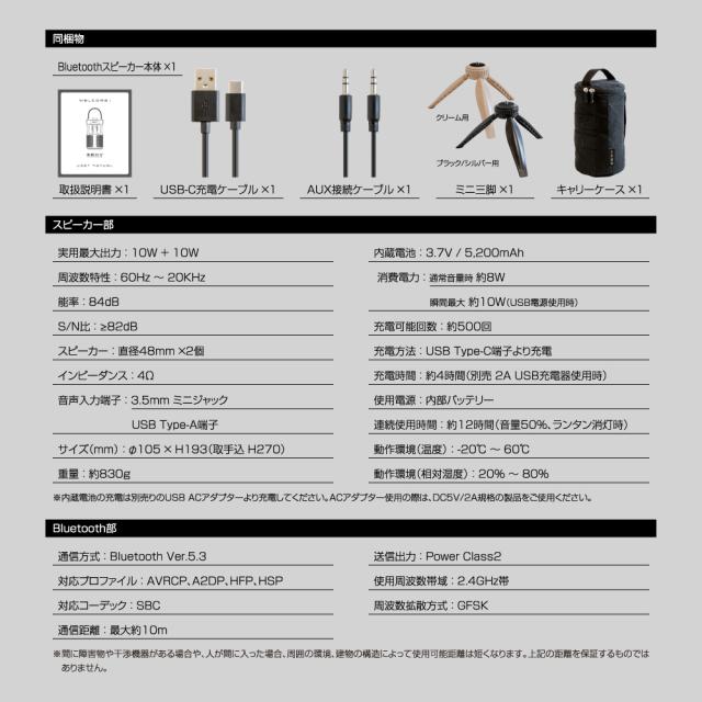 | スペック | ■スピーカー部仕様 ○実用最大出力 : 10W + 10W ○周波数特性 : 60Hz 〜 20KHz ○能率 : 84dB ○S/N比 : ?82dB ○スピーカーサイズ : 直径48mm ×2個 ○インピーダンス : 4Ω ○入力端子 : 3.5mm ミニジャック / USB Type-A端子 ○内蔵電池 : リチウムポリマー電池 3.7V / 5,200mAh ○消費電力 : 通常音量時約約8W 、 瞬間最大約10W(USB電源使用時) ○充電可能数 : 約500回 ○充電方法 : USB Type-C端子より充電 ※内蔵電池の充電は別売りのUSB ACアダプターより充電してください。ACアダプター使用の際は、DC5V/2A規格の製品をご使用ください。 ○充電時間 : 約4時間(別売 2A USB充電器使用時) ○使用電源 : 内部バッテリー ○連続使用時間 : 約12時間(音量50%時、ランタン消灯時) ○動作環境(温度) : -20℃ 〜 60℃ ○動作環境(相対湿度) : 20% 〜 80% ※結露の無いこと ■Bluetooth部仕様 ○通信方式 : Bluetooth Ver.5.3 ○対応プロファイル : AVRCP、A2DP、HFP、HSP ○オーディオ・コーデック : SBC ○通信距離 : 見通し距離 最大約10m ○送信出力 : Bluetooth標準規格Power Class2 ○使用周波数帯域 : 2.4GHz帯 ○周波数拡散方式 : GFSK ○※間に障害物や干渉機器がある場合や、人が間に入った場合、周囲の環境、建物の構造によって使用可能距離は短くなります。左記の距離を保証するものではありません。 |