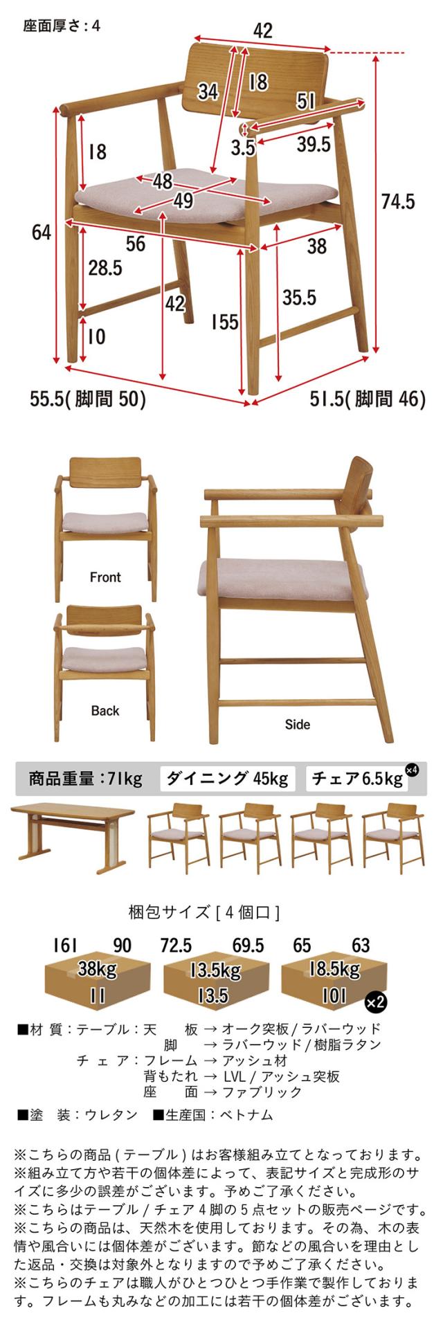 チェア:約W55.5 x D51.5 x H74.5cm(座面厚さ4cm)