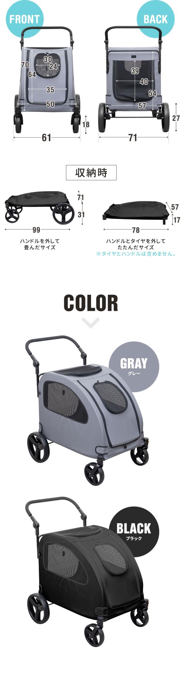 | サイズ: ・展開時:(約)幅61cm×奥行99cm×高さ112cm ※ハンドルの奥行は含まず ※ハンドル最大時高さ ・折りたたみ時?@(ハンドルのみ外した状態):(約)幅71cm×奥行99cm×高さ31cm ・折りたたみ時?A(ハンドルとタイヤを外した状態):(約)幅57cm×奥行78cm×高さ17cm ・ケージ部分内寸:(約)幅57cm×奥行78cm×高さ55cm ・飛び出し防止リードのサイズ:(約)幅2.5cm×長さ123cm※1本付属 ※ナスカンを含まず ※飛び出し防止リードは長さ調節可能 |