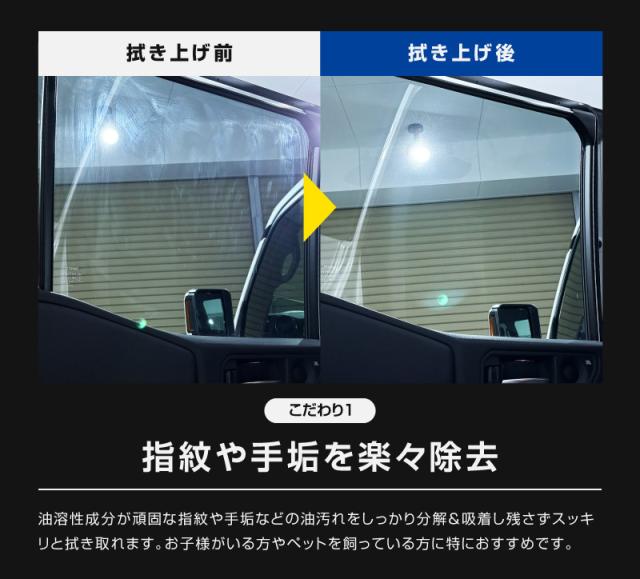 車内の窓ガラスや内装パネルに残りがちな指紋や手垢を簡単に取り除き、透明感あるガラスと清潔な車内を実現します。
