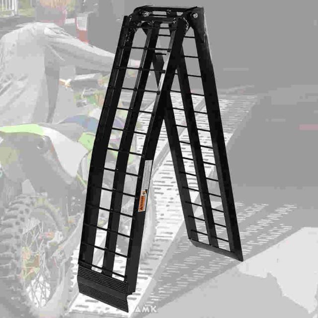 滑り止めと安定性:バイク用スロープには多数の小さな穴があり、摩擦を高めて滑りを防止します。 また、物を運ぶ際の安定性も高く、乾燥した接触面での使用を推奨しています。 このグループのアルミニウム製は、表面に滑り止めの穴が開いており、車体のグリップ力を高めてくれます。 強力な金属フック付きのハーネスを使用して車両に固定することができ、スロープをより安定させ、安全に使用することができます。