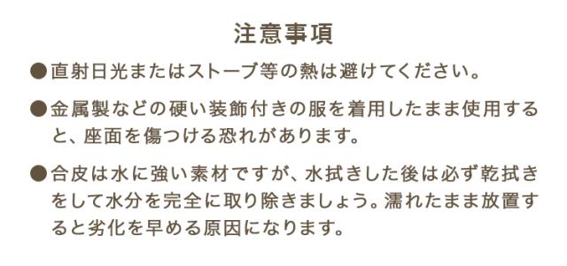 | 注意事項 | ・直射日光またはストーブ等の熱は避けてください。 ・金属製などの硬い装飾付きの服を着用したまま使用すると、座面を傷つける恐れがあります。 ・合皮は水に強い素材ですが、水拭きした後は必ず乾拭きをして水分を完全に取り除きましょう。濡れたまま放置すると劣化を早める原因になります。 ・商品は、モニターによって色合いが異なって見える場合があります。 ・仕様、デザインは改良のため予告なく変更することがあります。 |