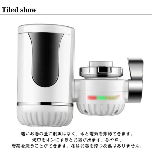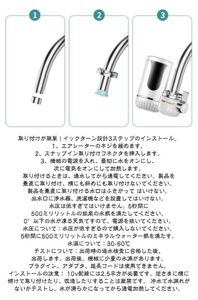 | 【高速加熱】速いお湯の量に制限はなく、水と電気を節約できます。蛇口をオンにするとお湯が出ます。手や皿、野菜を洗うことができます。冬はお湯を待つ必要はありません。 【インテリジェントな温度検知】温度表示、高感度温度センサー、水温のリアルタイム表示、使いやすい。 【安全性・耐久性】水路と電気路を分離して一体成型。 水や電気の漏れを防ぎ、潜在的な危険から電気を隔離します。 ヒートパイプは、熱伝導が速く、耐食性に優れたステンレス製です。より安心して使用できる。 【ホット&コールド両用】冷水と温水の出口があり、スイッチで直接操作できるのはとても便利です。 キッチンやトイレの必需品です。 【簡単なインストール】古い蛇口を分解する必要はなく、工具も不要で、すばやく直接インストールできます。冷水試験の水が漏れているかどうかを確認してください 漏れがなければ、それを使用して使用できます。 取り付けが簡単!イックターン設計3ステップのインストール。 1、エアレーターのネジを緩めます。 2、スナップイン取り付けコネクタを挿入します。 3、機械の電源を入れ、最初に水をオンにし、次に電気をオンにして加熱します。 取り付けるときは、通水してから通電してください。製品を垂直に取り付け、横にも斜めにも取り付けないでください。 製品を垂直に取り付ける水口はふさがって はいけない。出水口に浄水器、洗濯機などを設置してはいけない。 水圧は低すぎてはいけません。5秒間に500ミリリットルの鉱泉の水瓶を満たしてください。 0°以下の水が凍る天気ですので、電源を抜いてください。 水圧について:水圧が低すぎるので購入しないでください。5秒間に500ミリリットルのミネラルウォーター瓶を満たす。 水温について:30-60℃ テストについて:出荷時の過水検査に合格した後、出荷します。出荷後、機械に少量の水滴があります。プラグイン、アダプタ、延長コードは使用できません。 インストールの注意: 10v配線には2.5平方が必要です。逆さまに横に傾けて取り付けたり、改造したりすることは厳禁です。 冷水で水漏れがないかテストし、水が滑らかになってから通電加熱してください。 | |