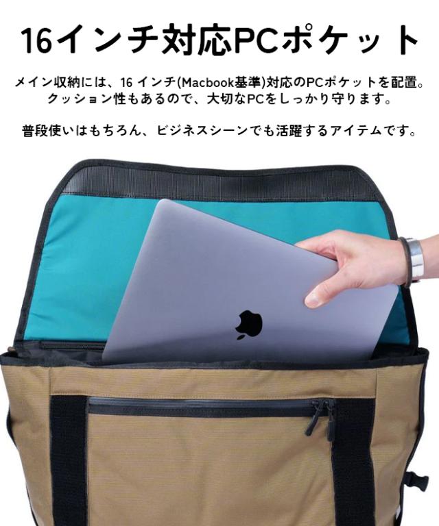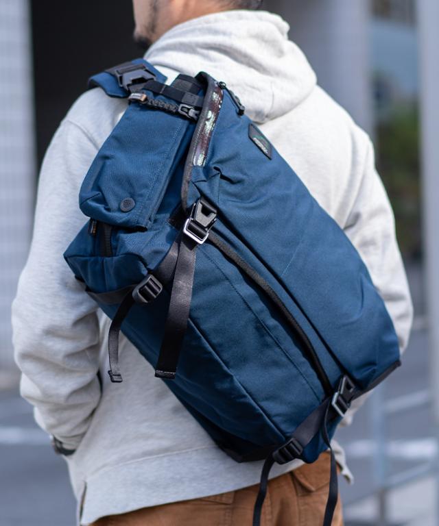 防水素材をもちろん、大きなフラップを開くことなくメイン収納にアクセスできるように配置されたジッパーや、左右どちらの肩にもかけられるようにショルダーストラップの付け替えが可能になっていたり、ユーザーにとって嬉しいギミックが盛り込まれています。
