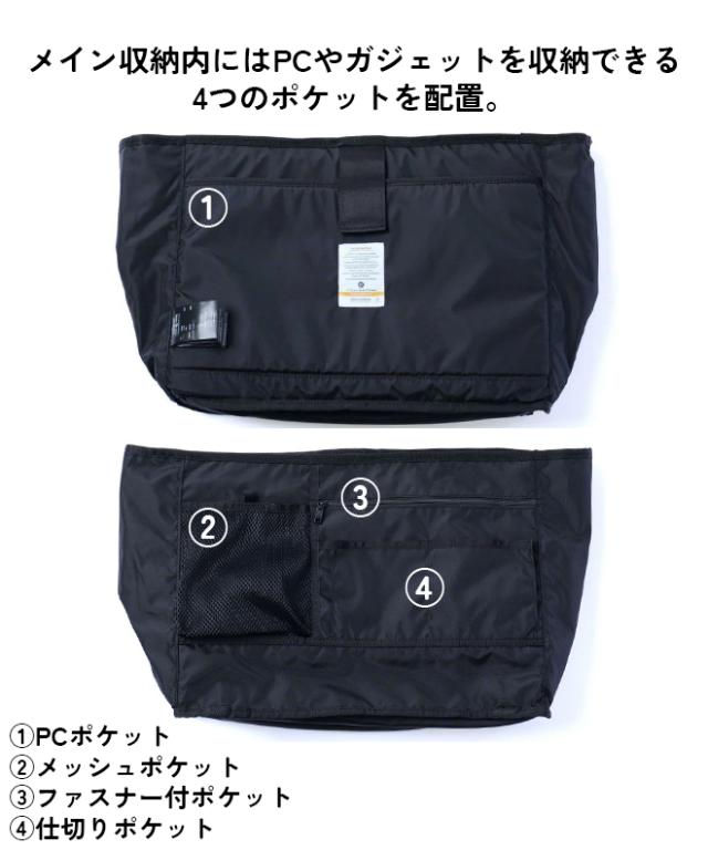 ドリンクポケットや鍵の収納に便利なリールカラビナ、A4ファイルも収納できるジップポケットなど収納も充実◎