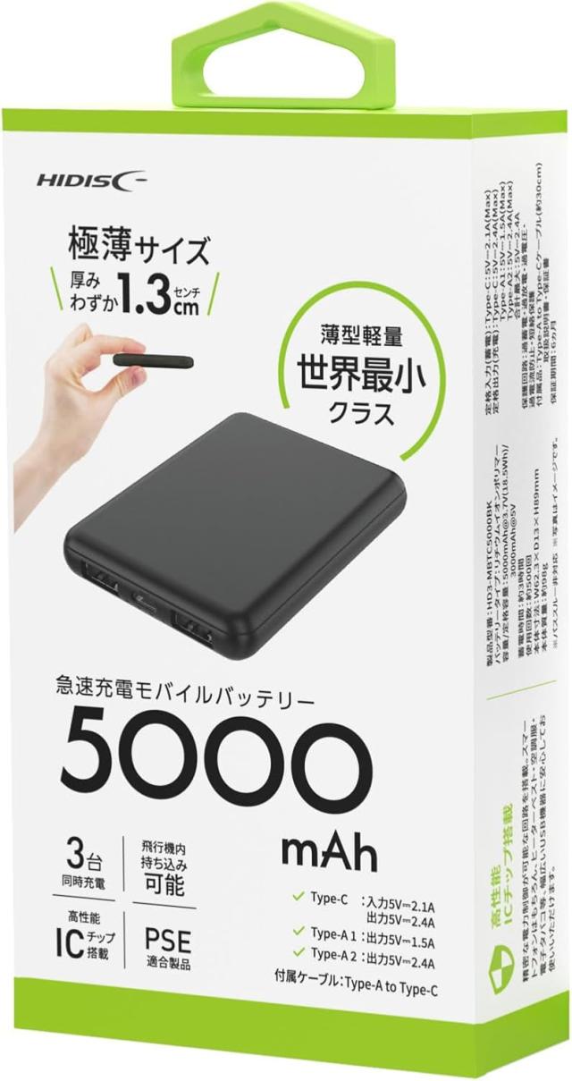 送料無料 急速充電 モバイルバッテリー 大容量 5000mAh 小型 薄型 軽量 3台同時充電 機内持ち込み可能 高性能ICチップ搭載 付属ケーブル30cm typeA to typeC PSE適合 スマホ スマートフォン モバ充 アイフォン アンドロイド 黒 ブラック
