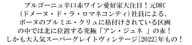 ブルゴーニュ辛口赤ワイン愛好家大注目!元DRC(ドメーヌ・ド・ラ・ロマネコンティ)社員による、ボーヌのプルミエ・クリュに格付けされている区画の中では北に位置する究極「アン・ジュネ 」の赤!しかも大人気スーパーグレイトヴィンテージ[2022]年もの!