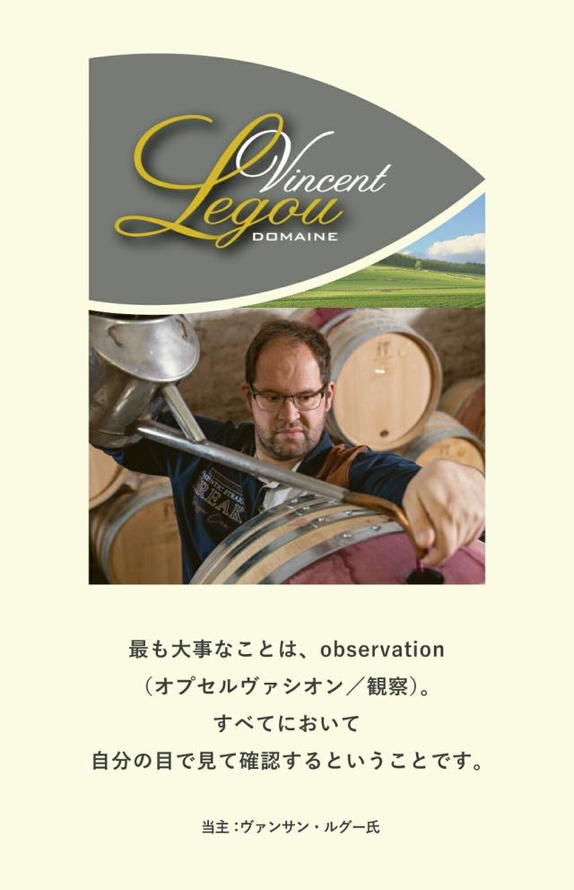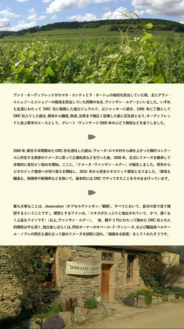 【2006年、都合8年間務めたDRC社を退社した彼は、ヴォーヌ・ロマネ村から畑を上がった隣村コンクールに所在する父のドメーヌに戻って土壌改良などを行った後、2008年、正式にドメーヌを継承して本格的に自社ビン詰めを開始。ここに、「ドメーヌ・ヴァンサン・ルグー」が誕生しました。