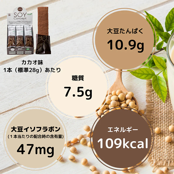 「SOY Concept Cacao ソイコンセプト カカオ 12個セット」は、動物性、マーガリン、ショートニング、小麦粉、保存料、人工甘味料、着色料、香料不使用の日本ベジタリアン協会推奨の植物性プロテインバーです。ガーナ等で栽培されるカカオ豆を使用し、チョコレートでは出せないカカオマス100%の自然なおいしさを味わえます。12個セット。
