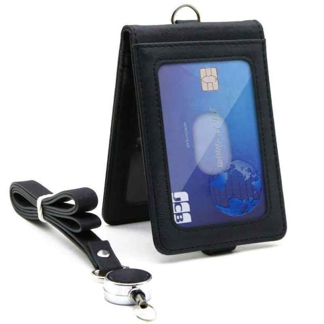 [Aemicion] 定期入れ IDカードホルダー パスケース パス入れ IDカードケース ネームホルダー icカードケース カードケース リール付き クリップストラップ付き 革 レザー 二面 メンズ レディース 通勤 通学 ブラック (Black)