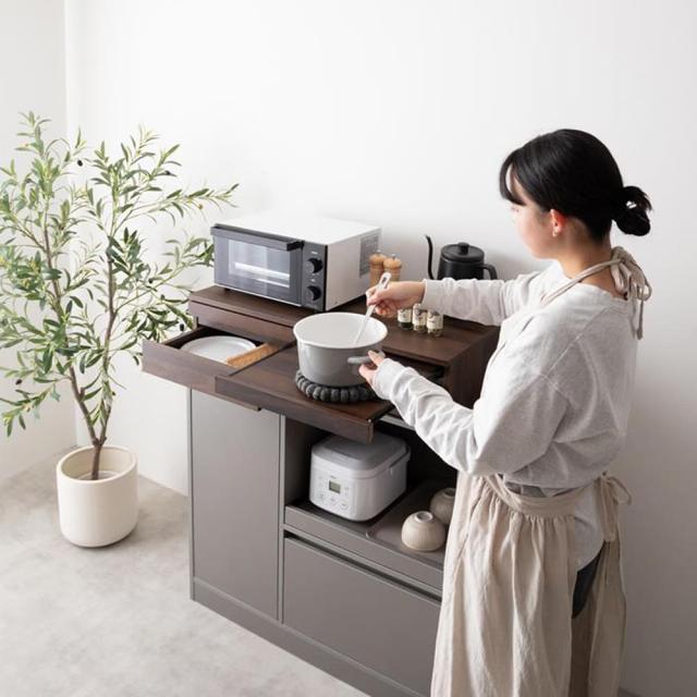 レンジ下のスペースを有効に使える「レンジ下収納」は、スライドトレーと広々した引き出しを備えた便利なアイテム。