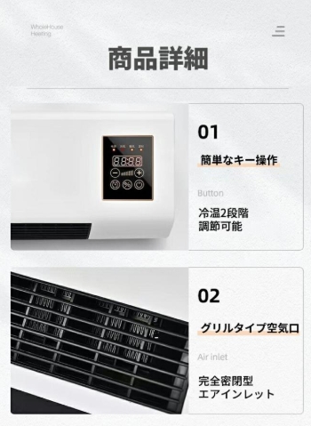 1.冷暖房:家全体の一定温度暖房、冷暖房、光なし、低騒音、冷温2段階調節可能。