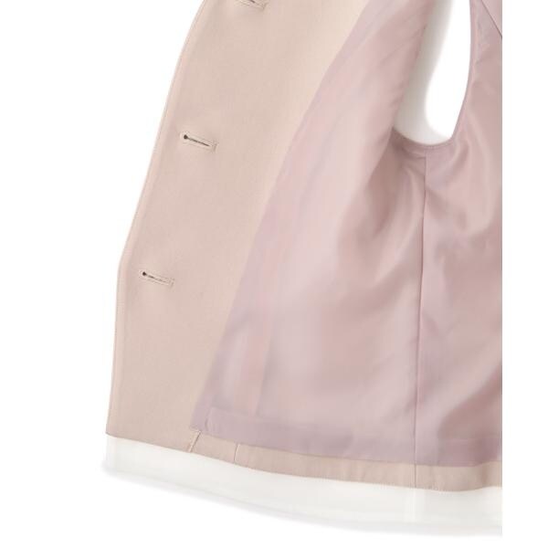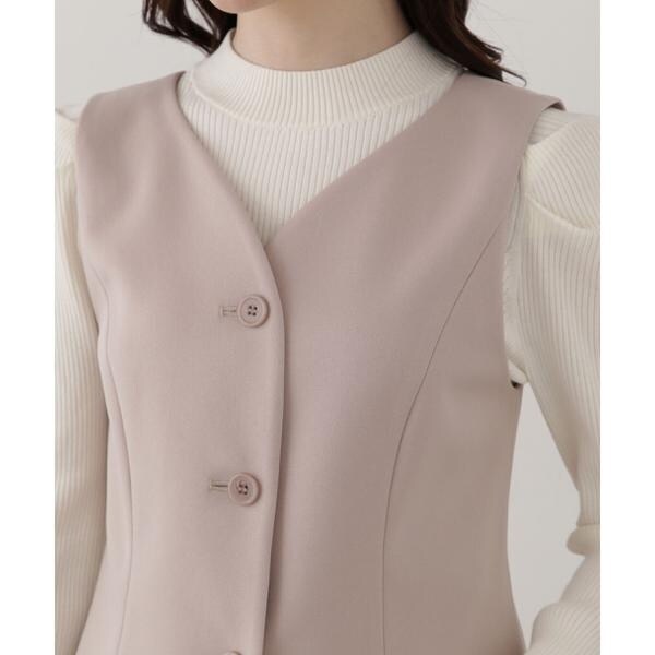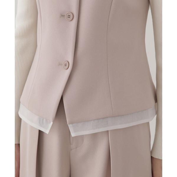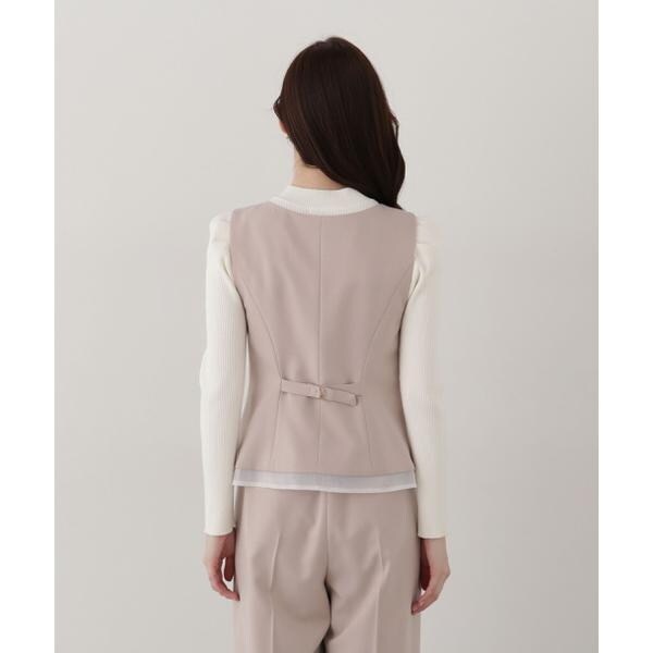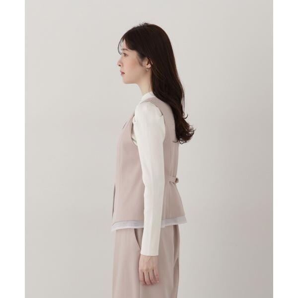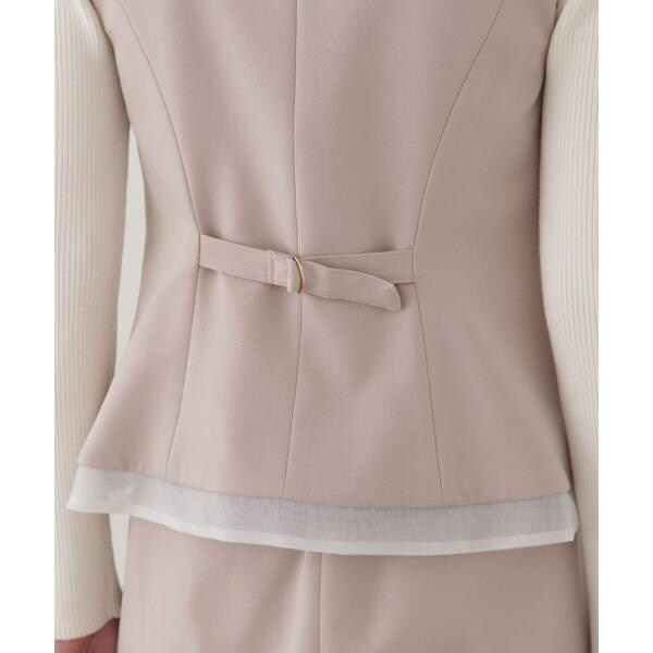 同素材のジャケット・ワイドパンツとスリーピース対応アイテム。一枚でも着られるよう仕上げた、キレイなデコルテラインのベストです。後ろに付けたベルトでウエストラインの微調整が可能。裾からのぞく軽やかな異素材がさり気なく愛らしいポイントになります。<素材>ポリエステルの彩目のきれいめ素材を使用しています。<詳細>仕様・前ボタン裏地・あり透け感・なし / 光沢・なし / 伸縮性・なし 生地の厚さ・普通<シリーズ>■ジャケット[品番:1215150102] ■パンツ[品番:1215130102] ※モデルの着用画像の場合、光の当たり具合により、実際の色味と異なって見えることがございます。色味は、商品単体の画像をご参照ください。