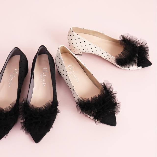 ・トレンドのチュールフリルがお花のような可憐なパンプス。