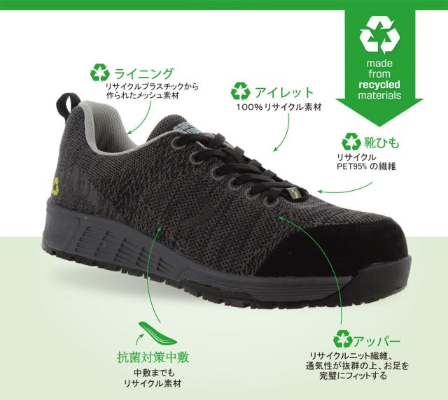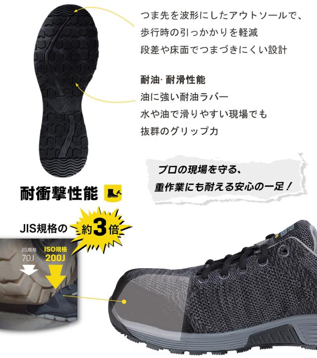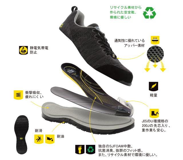 あらゆる作業環境で優れた耐滑性を発揮! JSAA A種&ISO規格・世界基準の安全靴! 軽量かつ高耐久のワークシューズ! ●JIS U種規格200Jの樹脂製先芯を採用しており、重作業でも安心して使用できます ●樹脂製の先芯がつま先をしっかりと保護し、耐衝撃性に優れた設計で釘やガラスの破片から足裏を守ります ●静電気放電(ESD)機能により、電子デバイスの破損を防ぎ、人体に帯電した静電気を逃がします。また、静電気による発火の危険も回避します ●かかとのエネルギー吸収機能が衝撃を軽減し、長時間の作業でも疲れにくい ●独自のSJ FOAM中敷は抗菌、消臭機能があり、汗を吸収して足元を快適に保ちます ●アッパー素材は通気性に優れ、環境に配慮したリサイクル素材を使用しています ※お使いのモニター設定、お部屋の照明等により、実際の製品と色味や素材感が異なる場合がございます 品番:ASG-B |
