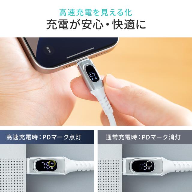 PD電力表示機能付き USB Type-Cケーブル USB PD240W対応 e-marker搭載 2m やわらかシリコンケーブル USB2.0 充電 データ転送 スマホ タブレット ホワイト[500-USB078-2]
