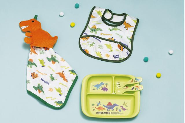 デフォルメされた恐竜がかわいいギフトセットです。マスコット付きハンドタオルやベビーエプロン、スプーン・フォーク、ランチ皿がセットになっているので、出産のお祝いにピッタリなアイテムです。
