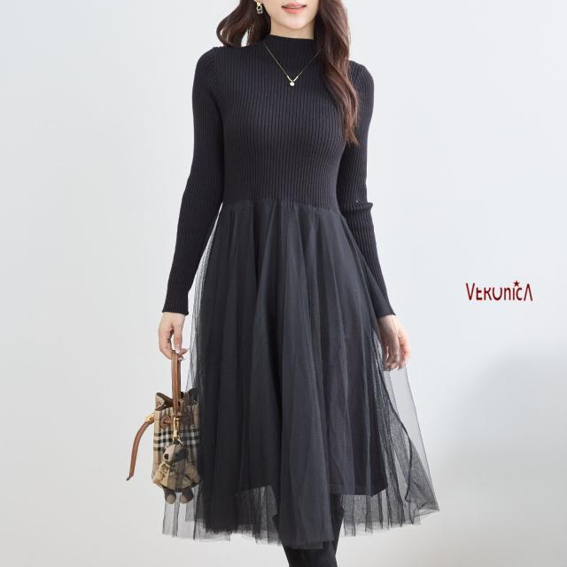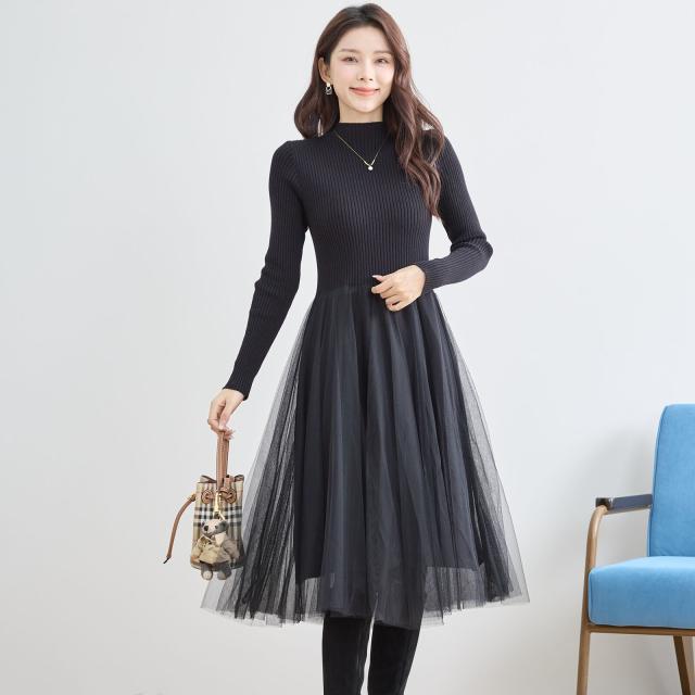 【即納】エレガントリブチュールレース切替ロングニットワンピース ドッキングワンピース長袖 膝下丈 美ライン 体型カバー AW 秋冬 新作