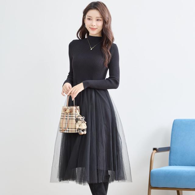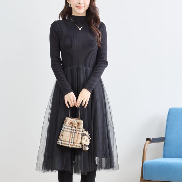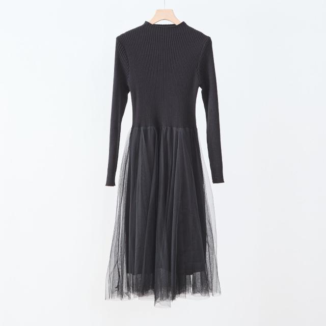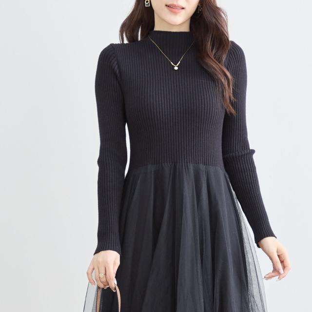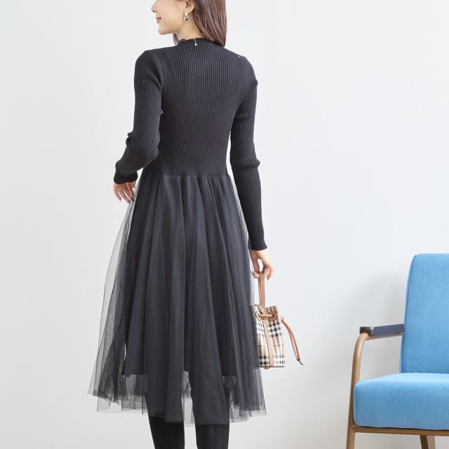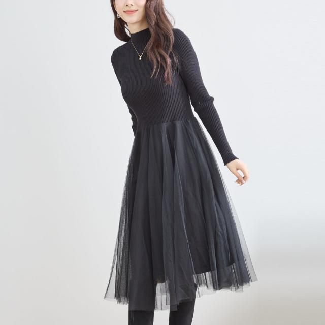 1枚でコーディネートが完成するリブニット切替ワンピース。シンプルなデザインがコーディネートの幅を広げてくれます。スカート部分はエレガントなチュールレースデザイン。
