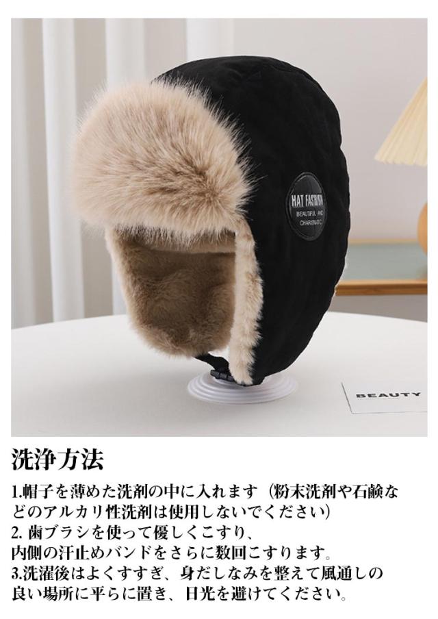 | ファーで丁度いいボリュームの耳当てと小ぶりのツバが可愛らしいデザイン。 ベースボールキャップよりファッション性が高く、 フライトキャップより気軽に被れる絶妙なバランス。 ワンランク上のキャップはいつものコーデにアクセントを加えてくれます。 アウトドアや、寒い日のお出かけにオススメしたいキャップです。 耳当て部分を垂らすととても暖かく、おしゃれ用だけではなく防寒にも最適です。 洗浄方法 1.帽子を薄めた洗剤の中に入れます(粉末洗剤や石鹸などのアルカリ性洗剤は使用しないでください) 2. 歯ブラシを使って優しくこすり、内側の汗止めバンドをさらに数回こすります。 3.洗濯後はよくすすぎ、身だしなみを整えて風通しの良い場所に平らに置き、日光を避けてください。 | |