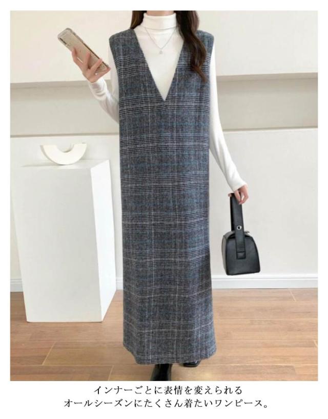 ツイード風 レディース ワンピース ジャンパースカート 秋 ロング ノースリーブ 深Vネック チェック柄 冬 大人 ジャンパースカート レイヤード オフィス 通勤 重ね着 秋冬 通学 カジュアル コーデ おしゃれ レディースファッション 20代 30代 40代 50代 60代