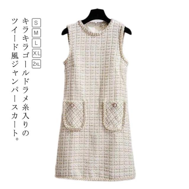 | キラキラゴールドラメ糸入りのツイード風ジャンパースカート。 中厚手のツイード風の異素材ミックス生地を使用。 ラメ糸も入っているので特別感のある装いに仕上げてくれます。 すとんとしたIラインシルエットで大人綺麗な雰囲気に。 インナーごとに表情を変えられる秋冬にたくさん着たいワンピース。 ミディ丈なので小柄な方にもおすすめです。 結婚式の二次会など、ちょっとしたオケージョンシーンでの活躍も期待できます。 | |