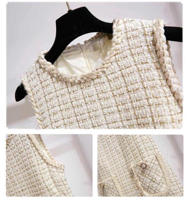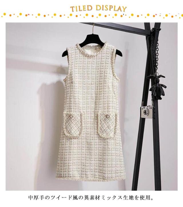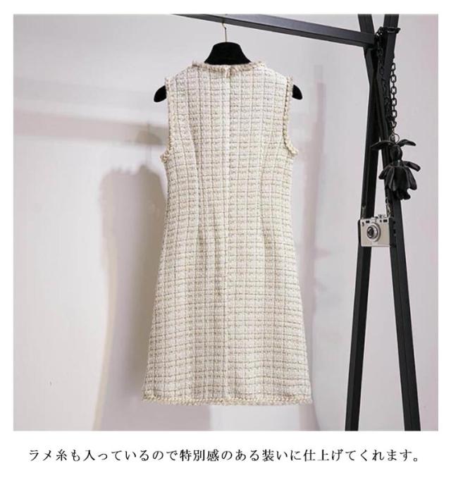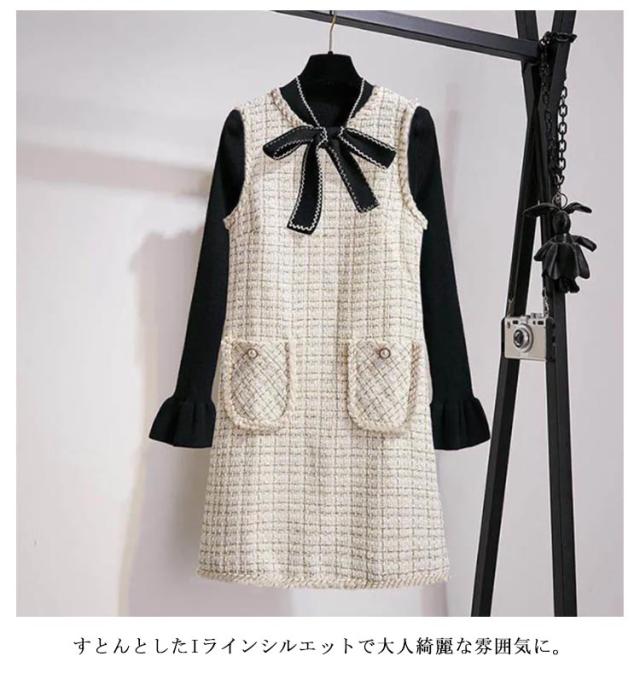 ミディアム丈 クルーネック ジャンスカ 冬 ワンピース ジャンパースカート 秋 ノースリーブ 通学 レディース 大人 カジュアル オフィス 通勤 チェック柄 コーデ パール付き 重ね着 レイヤード 20代 おしゃれ ホワイト ツイード風 30代 40代 50代