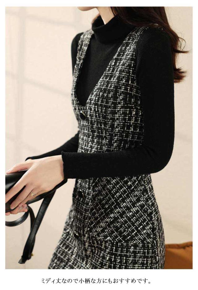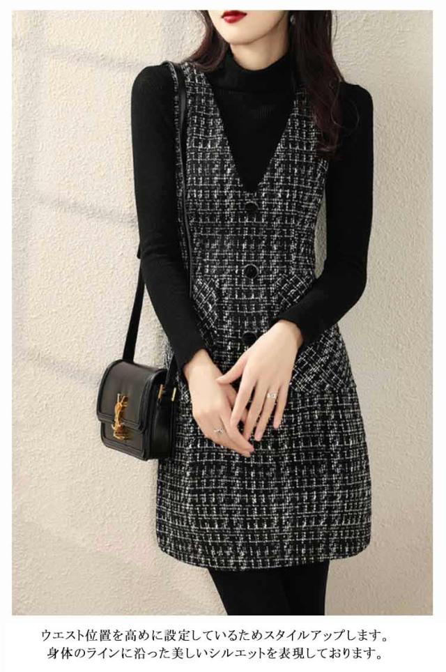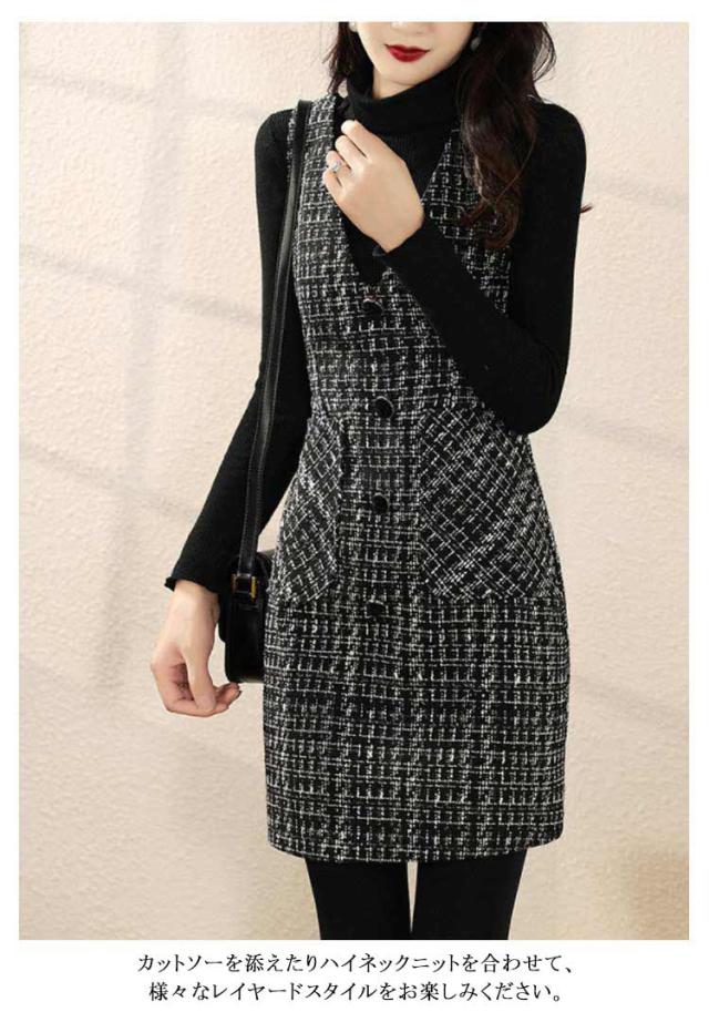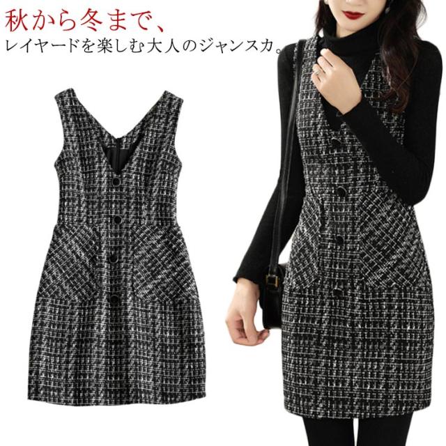 ツイード 大人 チェック柄 厚手 深Vネック ジャンスカ ワンピース ショート丈 ノースリーブ 膝上丈 通勤 ジャンパースカート 細身 秋 冬 重ね着 レイヤード コーデ スリムフィット きれいめ レディース オフィス ジャンパースカート おしゃれ 大きいサイズ