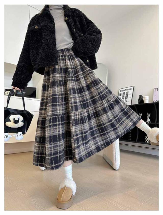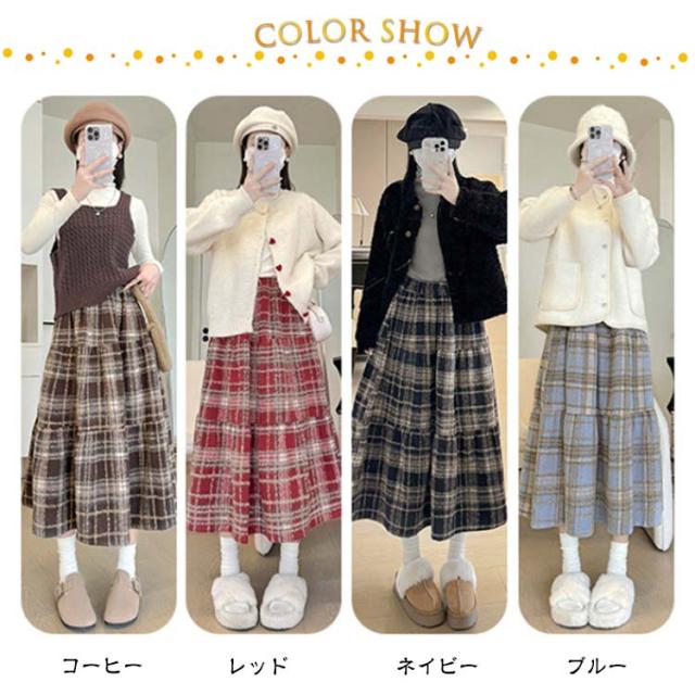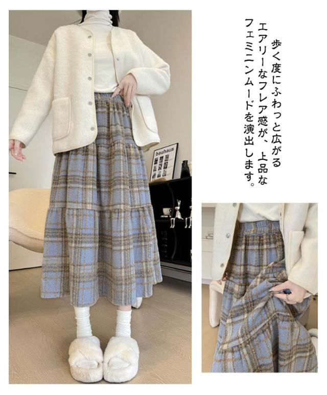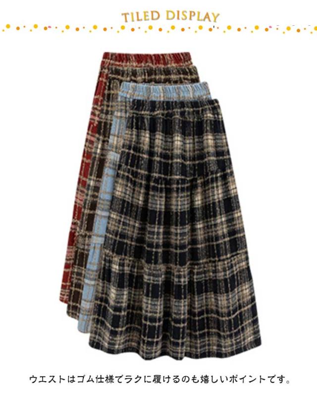 防寒 フレアスカート チェック柄 Aライン ハイウエスト レディース 厚手 ティアード カジュアル ティアードスカート 大きいサイズ ロングスカート 体型カバー あったか スカート チェックスカート ゴムウエスト 通勤 通学 大人 スカート 40代 30代 20代