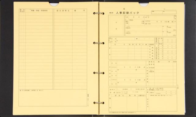 | 個人別の労働者名簿を専用封筒に印刷して、履歴書等の人事関係書類を入れることができるように工夫された商品です。 ※補充用人事記録パックは(注文番号:労務43-1)となります。 |