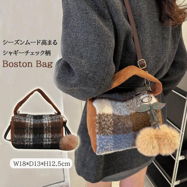・シーズンムード高まるシャギーチェック柄ミニボストンバッグ。