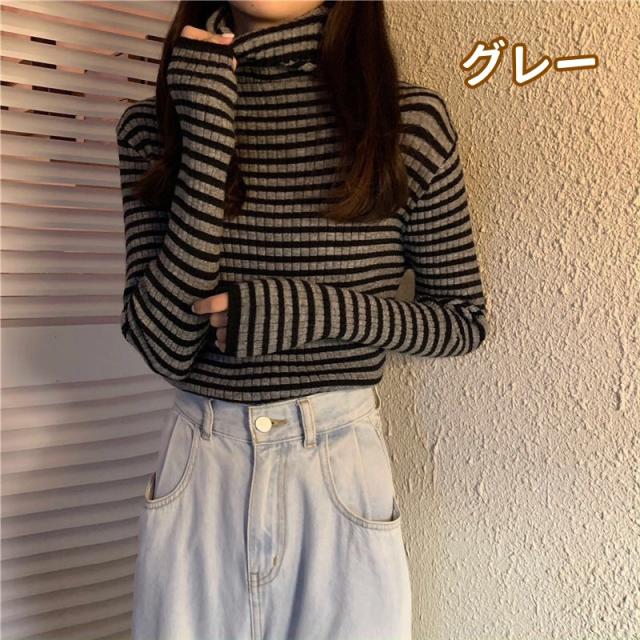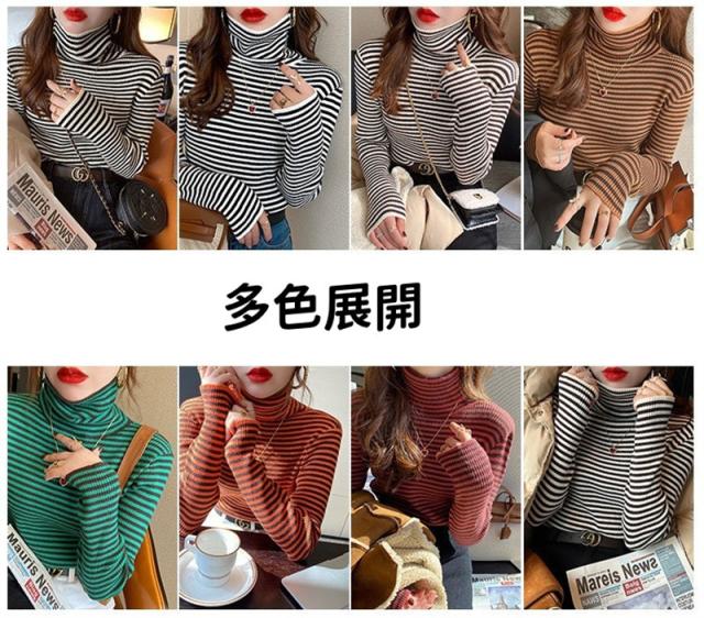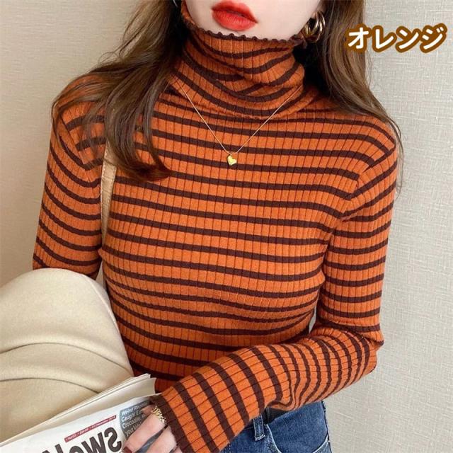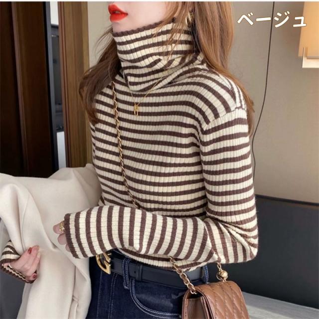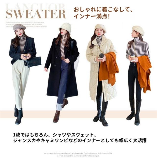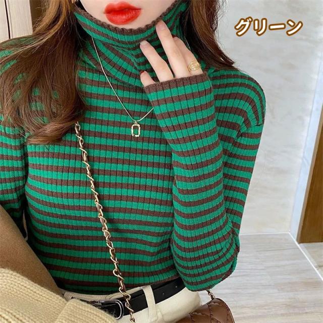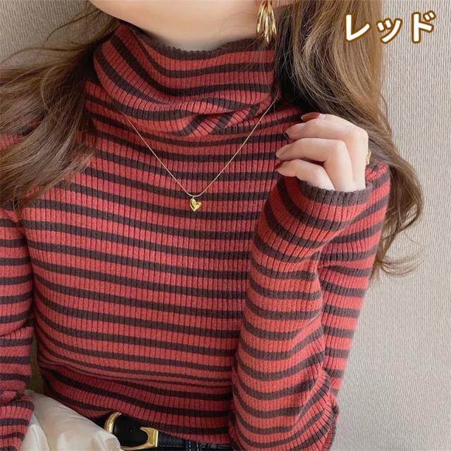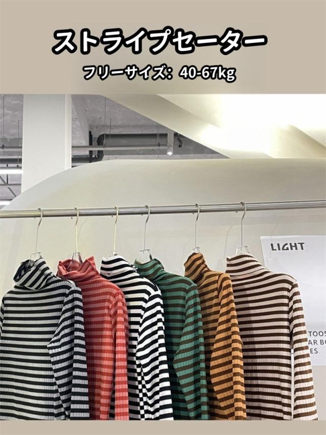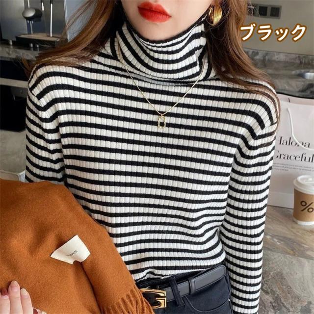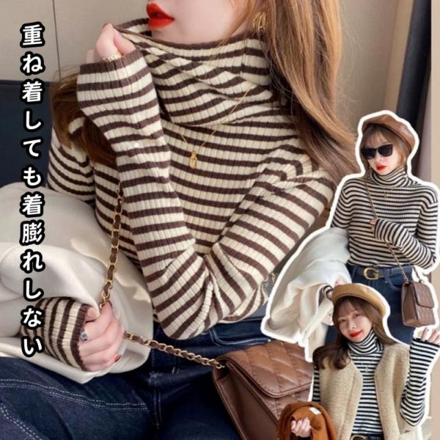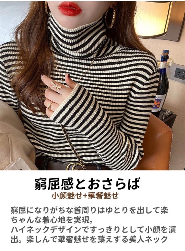 フリーサイズ カットソー リブニット ボーダー柄 春ニット 新作 レディース セーター ハイネック 長袖 暖かい ストレッチ トップス 秋冬ニット Tシャツ シンプル 上品 着回し カジュアル プルオーバー 重ね着 インナー