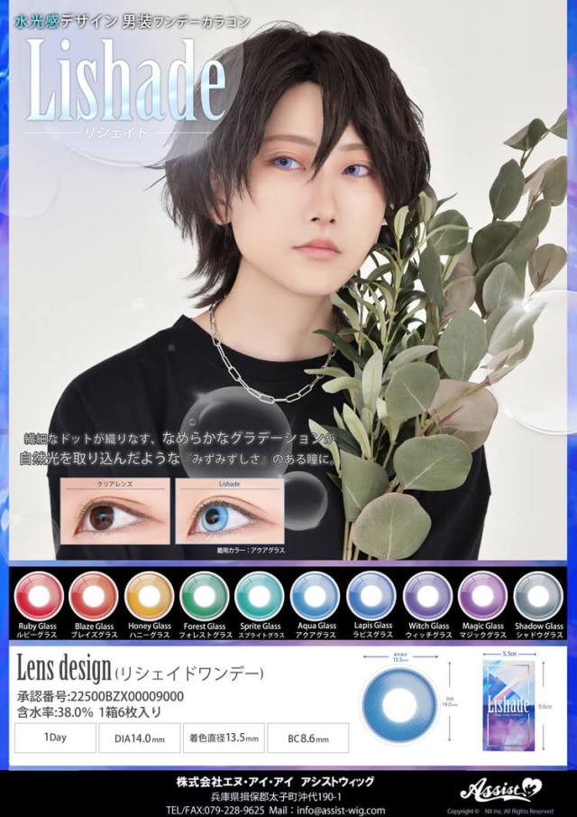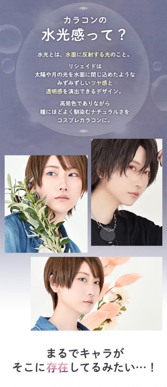 水光感デザイン! 男装ワンデーカラコン \ アシスト史上初 / 水光感デザインカラコン リシェイドは太陽や月の光を水面に閉じ込めたような みずみずしいツヤ感と透明感を演出できるデザイン。 高発色でありながら瞳にほどよく馴染むナチュラルさを コスプレカラコンに。 |