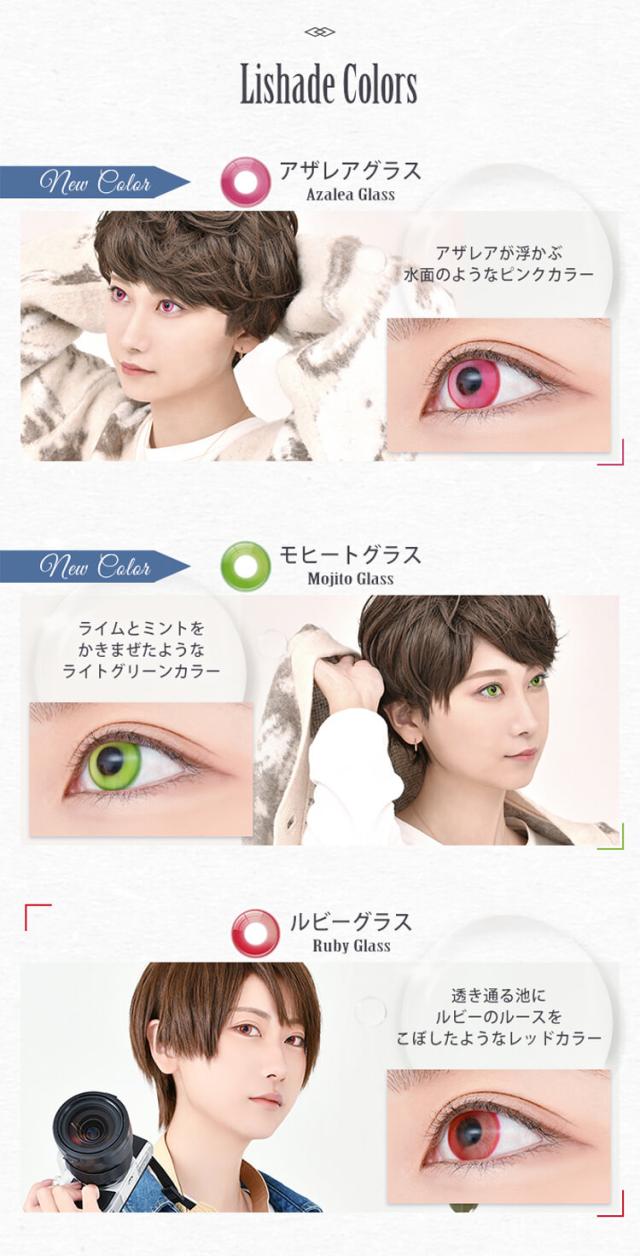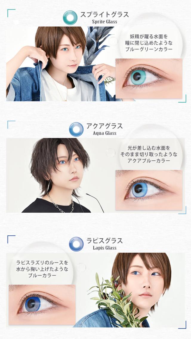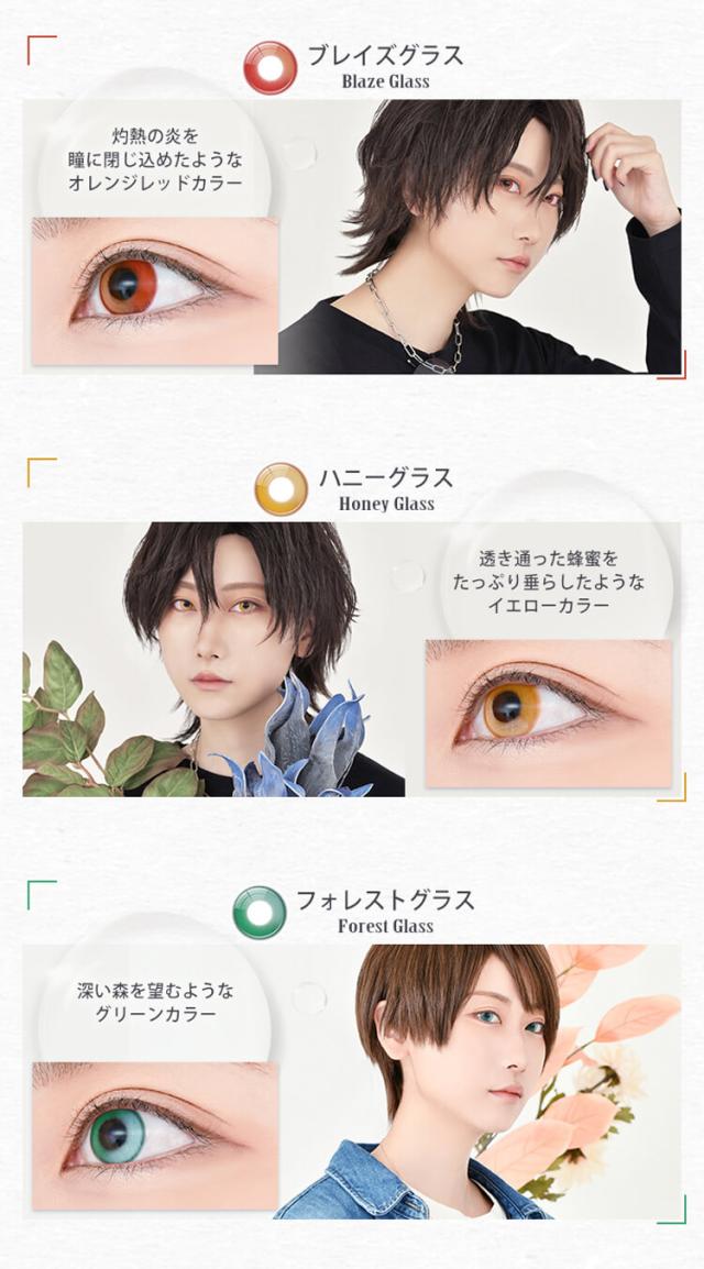 1.アザレアグラス(Azalea Glass) アザレアが浮かぶ水面のようなピンクカラー 2.モヒートグラス(Mojito Glass) ライムとミントをかきまぜたようなライトグリーンカラー 3.ルビーグラス(Ruby Glass) 透き通る池にルビーのルースをこぼしたようなレッドカラー 4.ブレイズグラス(Blaze Glass) 灼熱の炎を瞳に閉じ込めたようなオレンジレッドカラー 5.ハニーグラス(Honey Glass) 透き通った蜂蜜をたっぷり垂らしたようなイエローカラー 6.フォレストグラス(Forest Glass) 深い森を望むようなグリーンカラー 7.スプライトグラス(Sprite Glass) 妖精が踊る水面を瞳に閉じ込めたようなブルーグリーンカラー 8.アクアグラス(Aqua Glass) 光が差し込む水面をそのまま切り取ったようなアクアブルーカラー 9.ラピスグラス(Lapis Glass) ラピスラズリのルースを水から掬い上げたようなブルーカラー 10.ウィッチグラス(Witch Glass) 不思議な夜を水に溶かしたようなバイオレットカラー 11.マジックグラス(Magic Glass) マジックアワーの空を瞳に閉じ込めたようなパープルカラー 12.シャドウグラス(Shadow Glass) 水の影を瞳に閉じ込めたようなグレーカラー |
