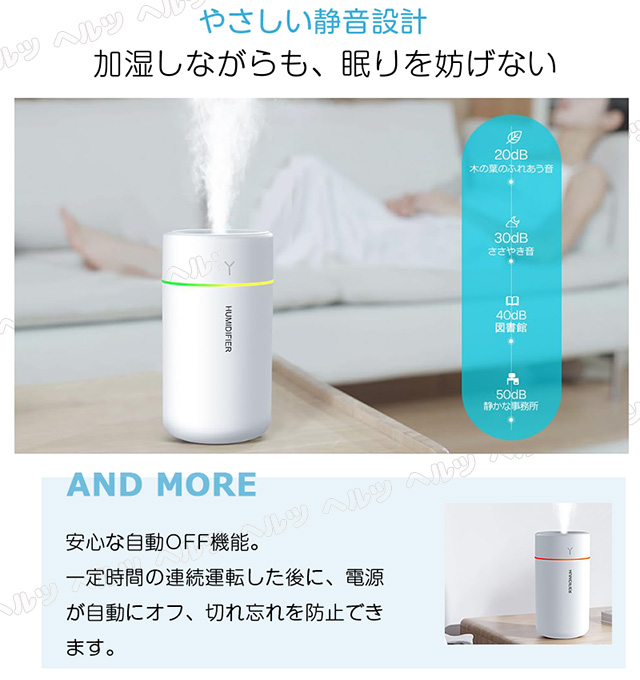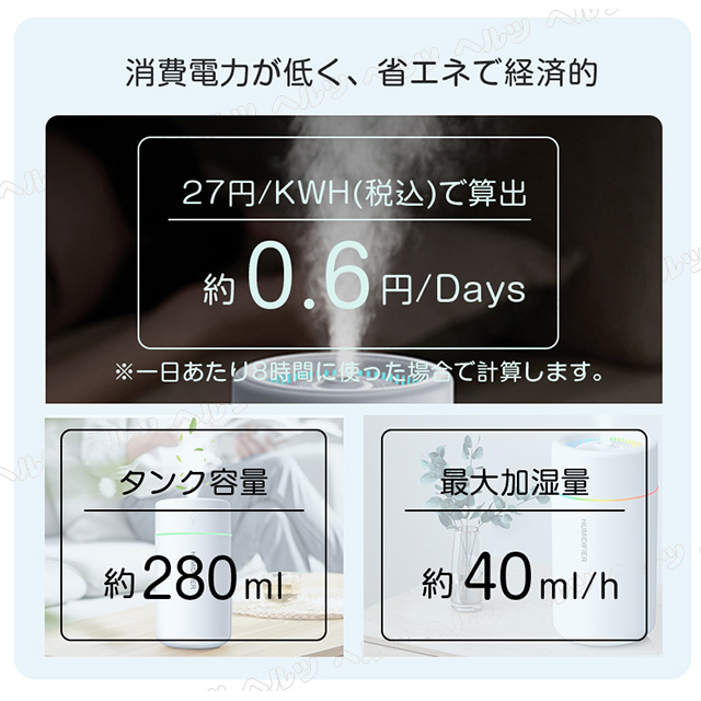【280ml大容量】 280ml大容量タンクの設計で、最大連続8時間使用を実現します!寝る前に水を一回入れて朝まで部屋を加湿して、一回給水すると、長い時間を使用するミニ加湿器となります。
